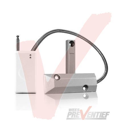 Uiteraard is deze draadloos en kan deze met gemak tientallen meters van het main-panel geplaatst worden. Dit roldeurcontact bestaat uit twee ijzeren strippen welke u afzonderlijk op de grond en aan de deur dient te bevestigen. Als deze twee strippen van elkaar verbroken worden zal de zender een signaal doorsturen naar de centrale unit. Staat het alarmsysteem dan actief dan zal uiteraard het alarmsysteem worden geactiveerd.